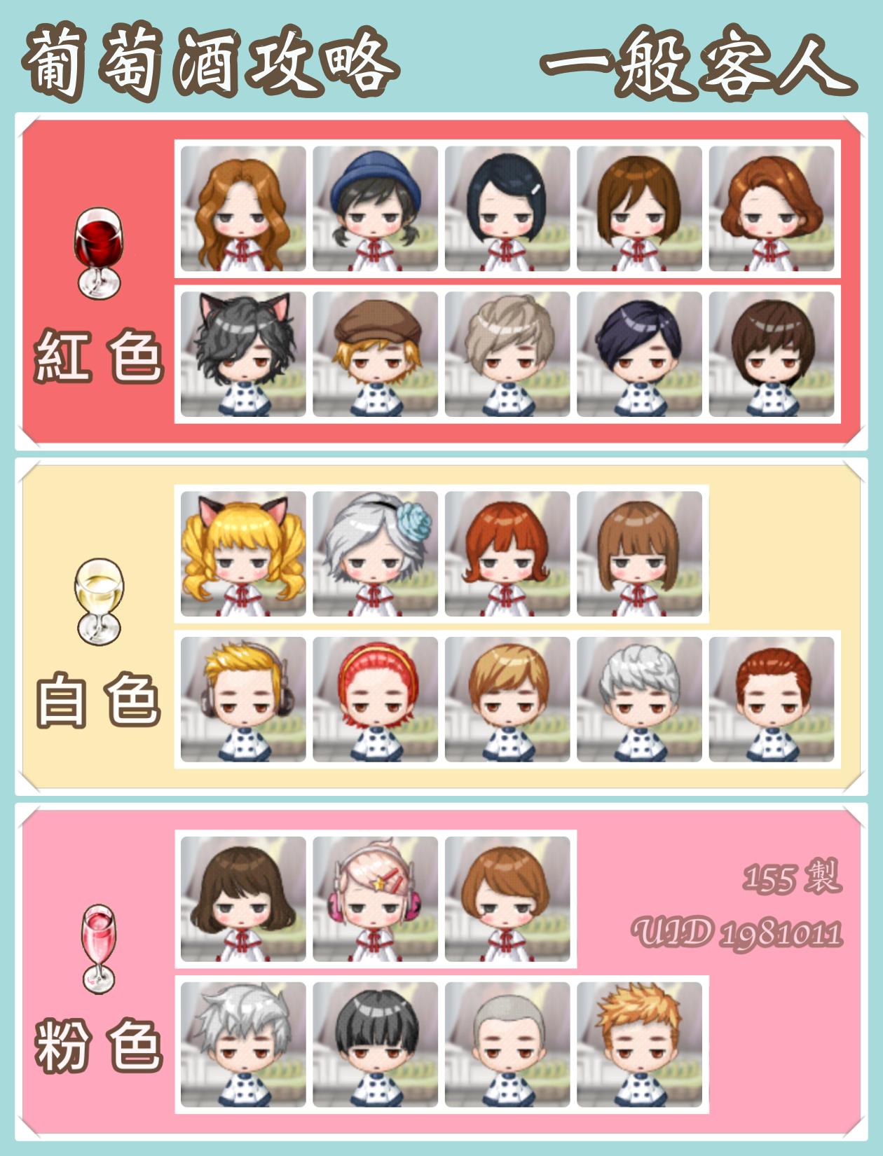 *客人喝哪類酒,只要根據客人髮型判斷(與髮色無關), 給對應種類的酒(紅白粉)即可